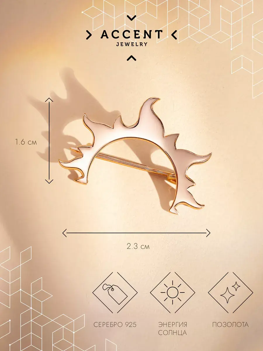Ювелирная брошь Солнце выполнена из серебра 925 пробы. Брошь покрыта высококачественным слоем позолоты. При должном уходе украшение надолго сохранит свой первоначальный вид и блеск.