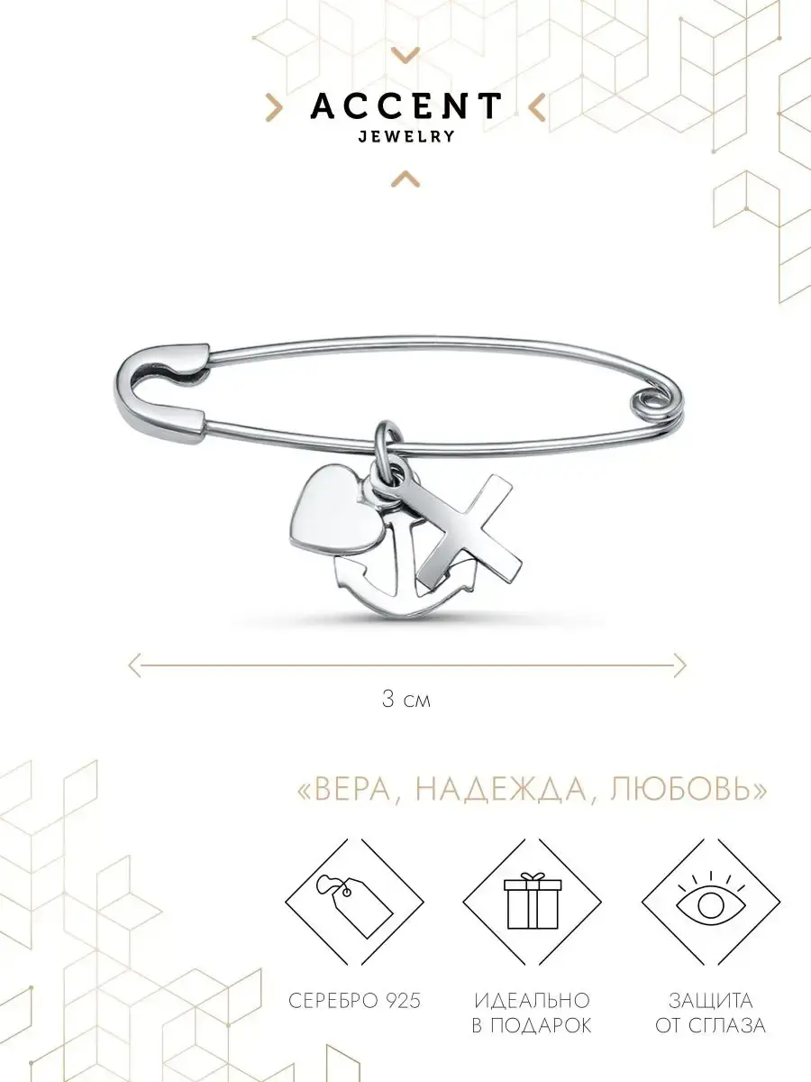 Серебряная булавка брошь с символом Вера Надежда Любовь. Брошь это аксессуар, который придаст шарма и изысканности вашему стильному образу. Брошь - булавка прекрасно дополнит любой элемент вашего гардероба: от головных уборов, до жакетов и верхней одежды. Стильная брошка станет оригинальным комплиментом в подарок маме, подруге, коллеге, любимой на день рождения, юбилей, именины, день Ангела.