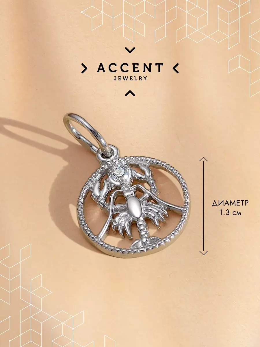 Подвеска из серебра 925 пробы, покрыта слоем родия, защищающим изделие от потемнения и позволяющим надолго сохранить первоначальный вид изделия при соблюдении правил ухода. Диаметр подвески - 1,3 см. Подвеска украшена прозрачным фианитом, искрящимся на солнце. В коллекции Знаки Зодиака представлены 12 серебряных подвесок, изображающих символы: