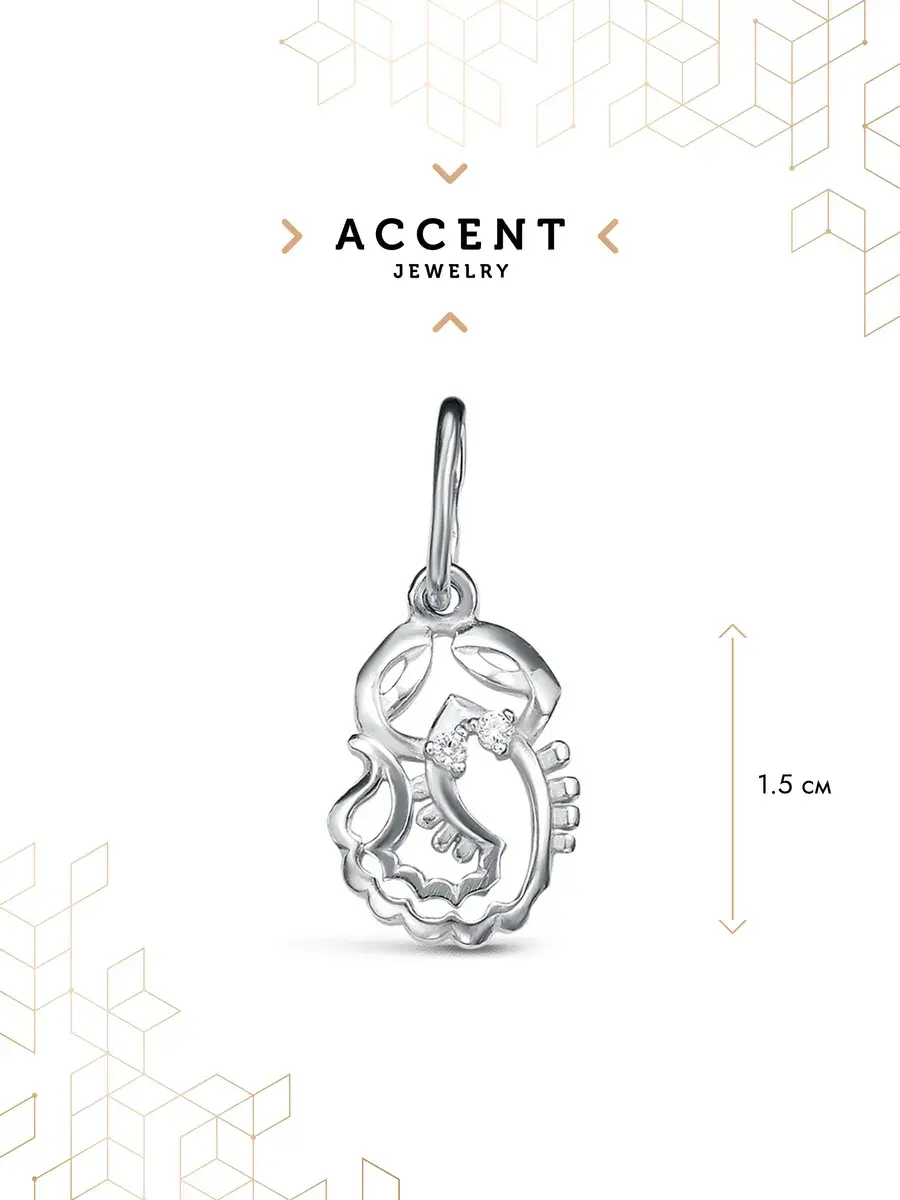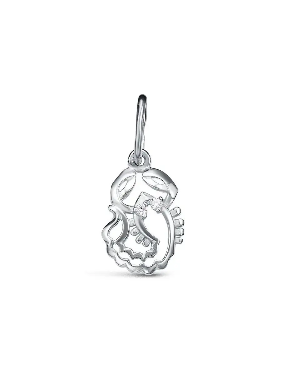 Подвеска из серебра 925 пробы, покрыта слоем родия, защищающим изделие от потемнения и позволяющим надолго сохранить первоначальный вид изделия при бережном отношении. Диаметр подвески - 1,0 см. Подвеска украшена прозрачным фианитом. В коллекции Знаки Зодиака представлены 12 серебряных подвесок, изображающих символы.