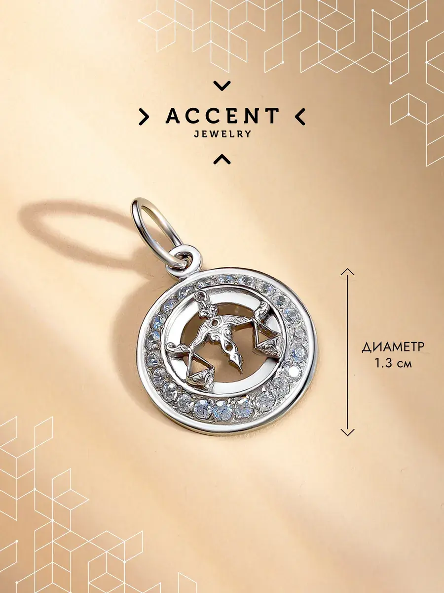 Подвеска из серебра 925 пробы, покрыта слоем родия, защищающим изделие от потемнения и позволяющим надолго сохранить первоначальный вид изделия при бережном отношении. Диаметр подвески - 1,3 см. Подвеска украшена россыпью прозрачных фианитов. В коллекции Знаки Зодиака представлены 12 серебряных подвесок, изображающих символы.
