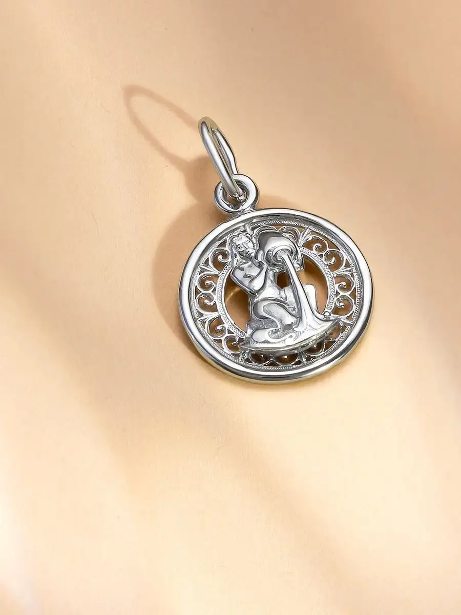 Подвеска из серебра 925 пробы, покрыта слоем родия, защищающим изделие от потемнения и позволяющим надолго сохранить первоначальный вид изделия при бережном отношении. Диаметр подвески - 1,4 см. В коллекции Знаки Зодиака представлены 12 серебряных подвесок, изображающих символы.